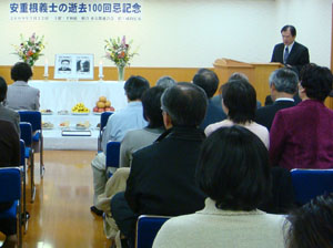 これは、安重根義士がハルピン駅頭で伊藤博文公を射殺した1909年10月26日から今年は100周年〔昨年から韓国において4大記念事業(記念館の新築、銅像の再建、思想「東洋平和論」に関する国際学術大会、義挙100周年記念春川マラソンの)が計画されている〕であり、また、安義士が翌1910年3月26日に死刑となってから今年が100回忌にあたることにちなむものであり、安義士と伊藤公の和合を祈願するための礼式としているものだ。