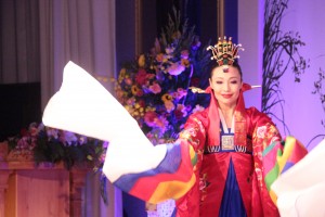 講演の後には曺永姫さんによる韓国舞踊が会場に大きな感動を与えました。優雅で何か神秘的な韓国舞踊は、会場の人びとの心をしっかり捉えたようです。更に、日本の少年少女の二人が韓国の太鼓の踊りを公演し、大きな拍手を受けていました。そして、最も盛り上がった乙倉俊さんによる日本の伝統和太鼓の公演と韓国舞踊の長鼓の合同演奏は、新しい日韓の交流と友好推進を実感させるものでありました。最後に韓国婦人達による「統一の歌」を参加者一同で歌って、会は幕を下ろしました。