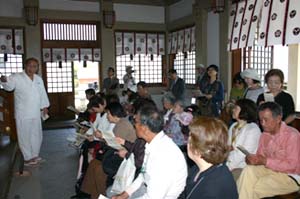 普段は一般の参拝客が入れない拝殿にも特別入れて頂き、宮司さんから神社の由緒と鞆の浦の歴史について詳しく説明して頂いた。翌日に神事で舞いを奉納する為、地元の有志たちが集い、能楽堂で稽古をしているのに遭遇することが出来た。普段は締め切られている所なので本当に幸運であった。