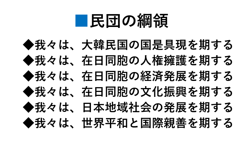 民団綱領の中で、最近追加された項目は「我々は、日本地域社会の発展を期する」と言う部分だ。この内容が出てきた理由は、2012年2月23日、在日本大韓民国民団第7次宣言の中に「我々は、地域住 民として生活・文化・福祉など各面で地域社会や自治体との友好を増進し、日本社会に貢献する模範的な市民たらんとする(6番)」と「我々は日本自らが永住外国人の地方参政権を付与するよう促すとともに、日本社会のさらなる国際化と多文化共生共栄社会の実現に貢献する(7番)」と言う基本姿勢を見れば良く知ることができる。